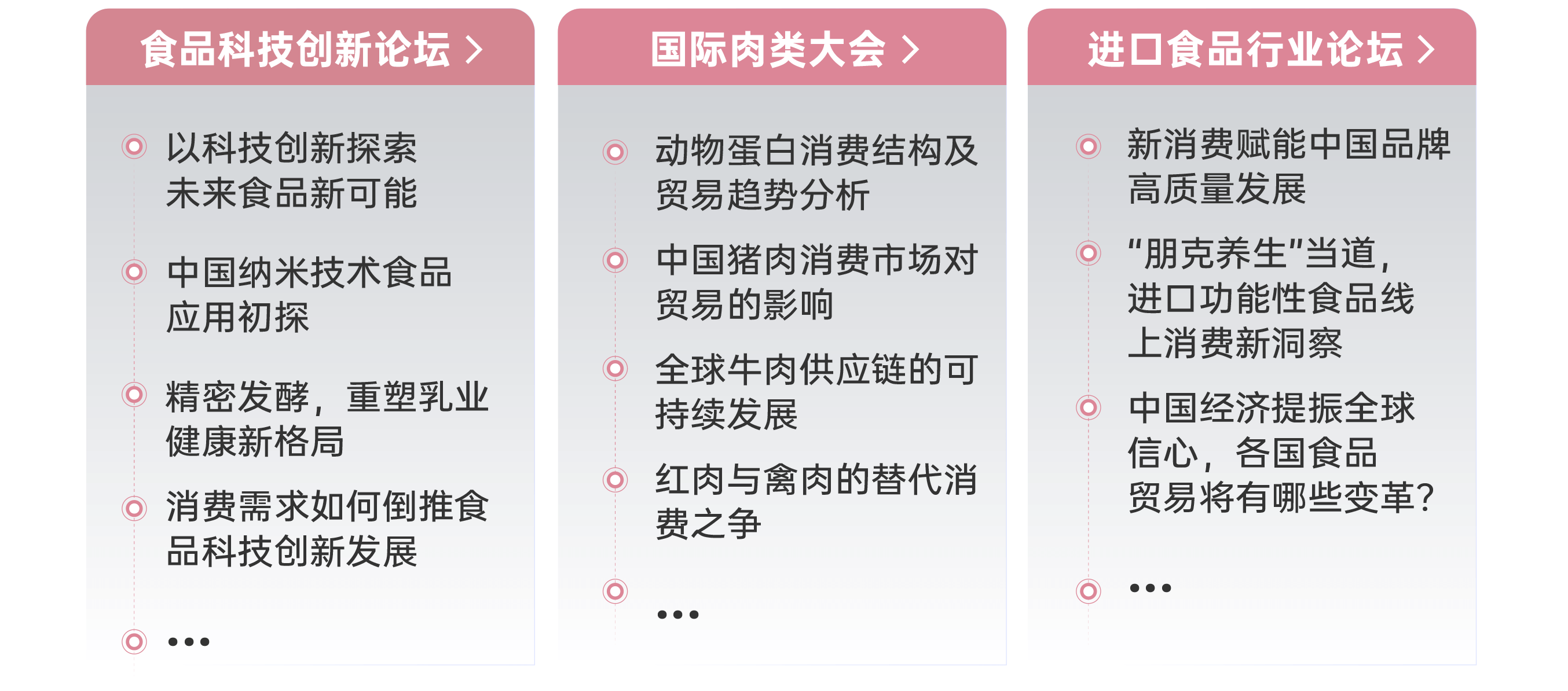 | 作為SIAL世界三大食品展之一,SIAL西雅展(上海)2023年規模預計將達到18萬平方米、4,500+全球展商、12大主題館、14個熱點專區、30萬件展品,同期舉辦的第四屆SIAL世界食品產業峰會以“經緯世界,擁抱變革”為主題,聚焦新零售、供應鏈、肉類、飲品、食品科技、進口食品、食品投融資、中餐等食飲行業熱門話題,9大主題論壇早鳥票火熱搶購中! |