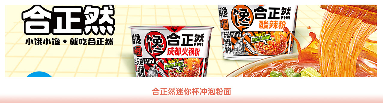 「合正然」品牌創立于2023年,以“小餓小饞 就吃合正然”為品牌理念,致力于打造:速食零食化、低客單高性價比的全品類潮流速食。目前已開發出“饞”、“鮮”、“爽”、“飯”、“燙”五大系列方便食品。