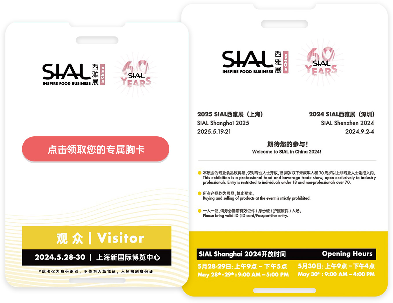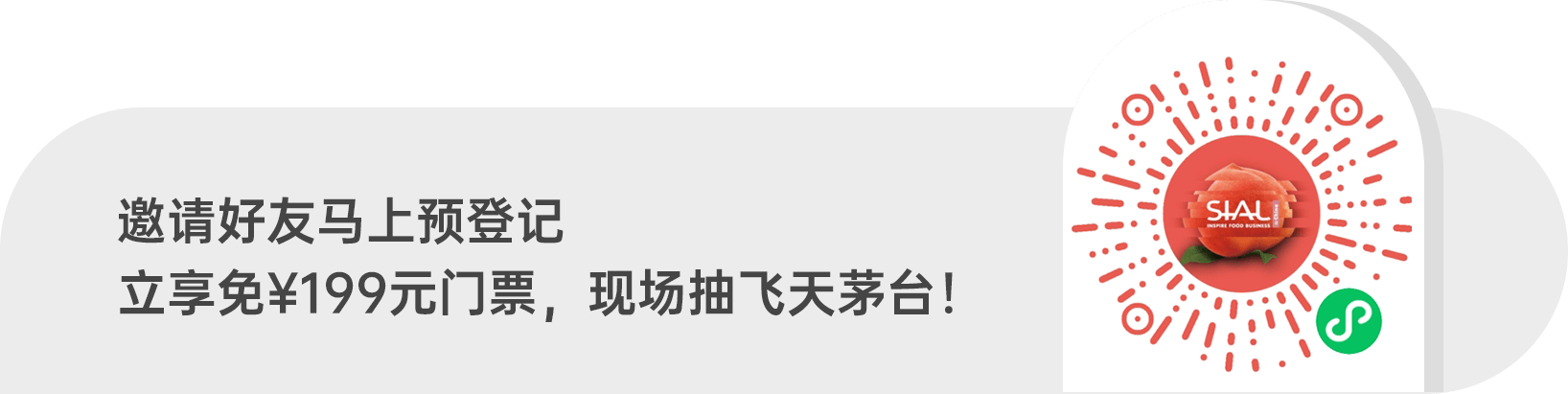 | 1. 提前申請(qǐng)預(yù)登記門票,可節(jié)省展會(huì)現(xiàn)場(chǎng)199元門票費(fèi)用; 2.通過官網(wǎng)“SIAL商機(jī)在線”和微信“SIAL在線”小程序平臺(tái),提前預(yù)約心儀展商,精準(zhǔn)貿(mào)易對(duì)接,參展效率加倍; 3.提前獲得與全球75個(gè)國家和地區(qū)的5,000+展商洽談貿(mào)易的機(jī)會(huì),展會(huì)現(xiàn)場(chǎng)更有全球350,000+好品等您選。 | |||