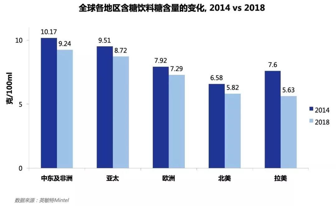 到2020年,為產品減糖仍將是飲料制造商面臨的首要任務。據英敏特數據,全球各地區含糖飲料糖含量都有不同程度的降低(2014-2018年),特別在亞太地區,糖含量降低了8.3%。