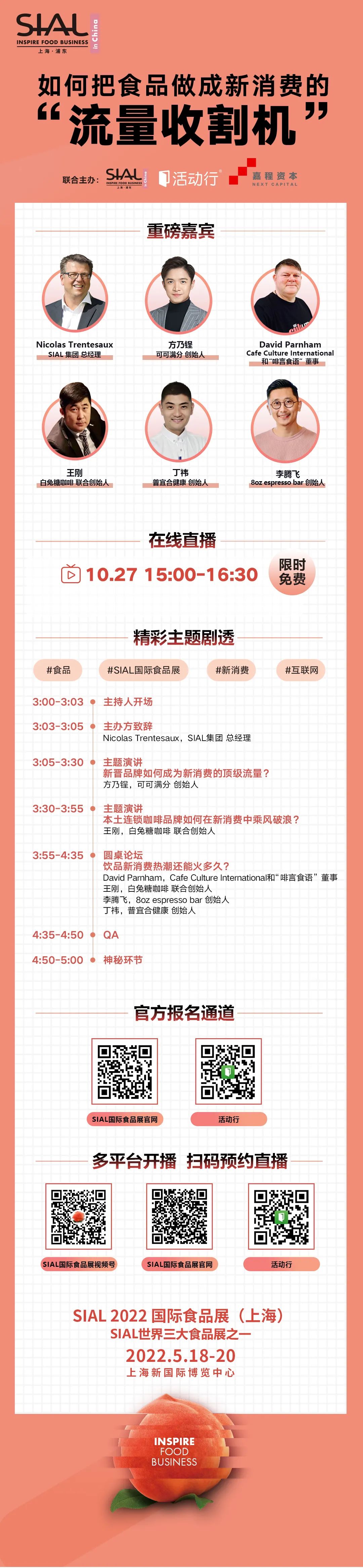 食品新消費(fèi)千億市值品牌需要新的視野與打法。SIAL自1964年巴黎成立以來一直通過SIAL 在線智庫(SIAL Think Tank)聚集全球最具創(chuàng)新力的食品品牌,為食品行業(yè)帶來前瞻性思考。10月27日(周三)下午3:00-5:00,SIAL在線智庫直播計(jì)劃正式開啟,在第一期直播中,來自新消費(fèi)飲品的新銳品牌高管將分享:如何把食品做成新消費(fèi)的“流量收割機(jī)”