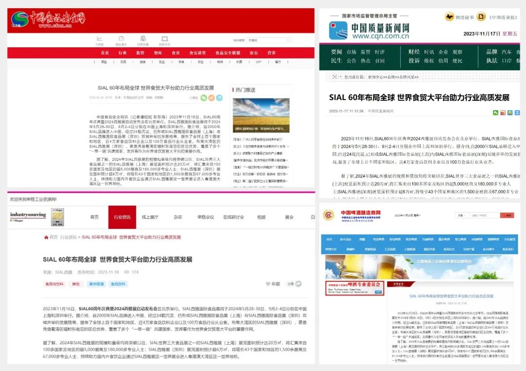 11月16日,SIAL60周年慶典暨2024西雅展啟動發布會在京舉行。隨后一條題為“SIAL 60年布局全球 世界食貿大平臺助力行業高質發展”的消息迅速被新華網、人民網、環球網、CHINA DAILY等主流官媒以及一眾行業媒體競相報道,百余媒體強勢聚焦,SIAL西雅展影響力再破圈。