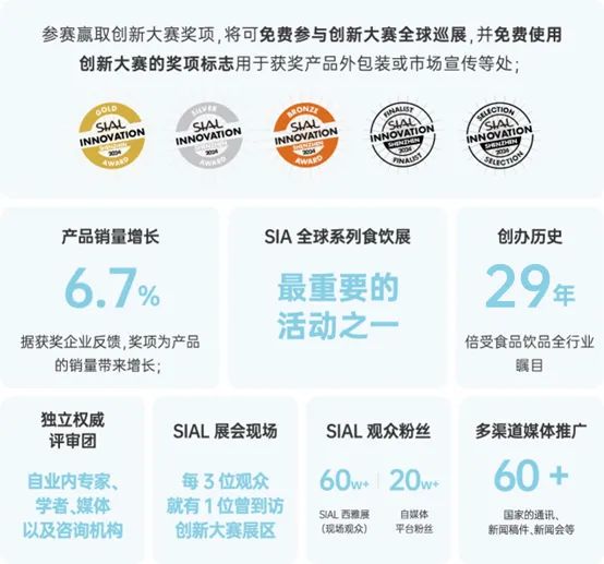 8. 入圍產(chǎn)品可免費(fèi)使用“2025 SIAL 創(chuàng)新大賽” Logo在該產(chǎn)品包裝上進(jìn)行推廣;