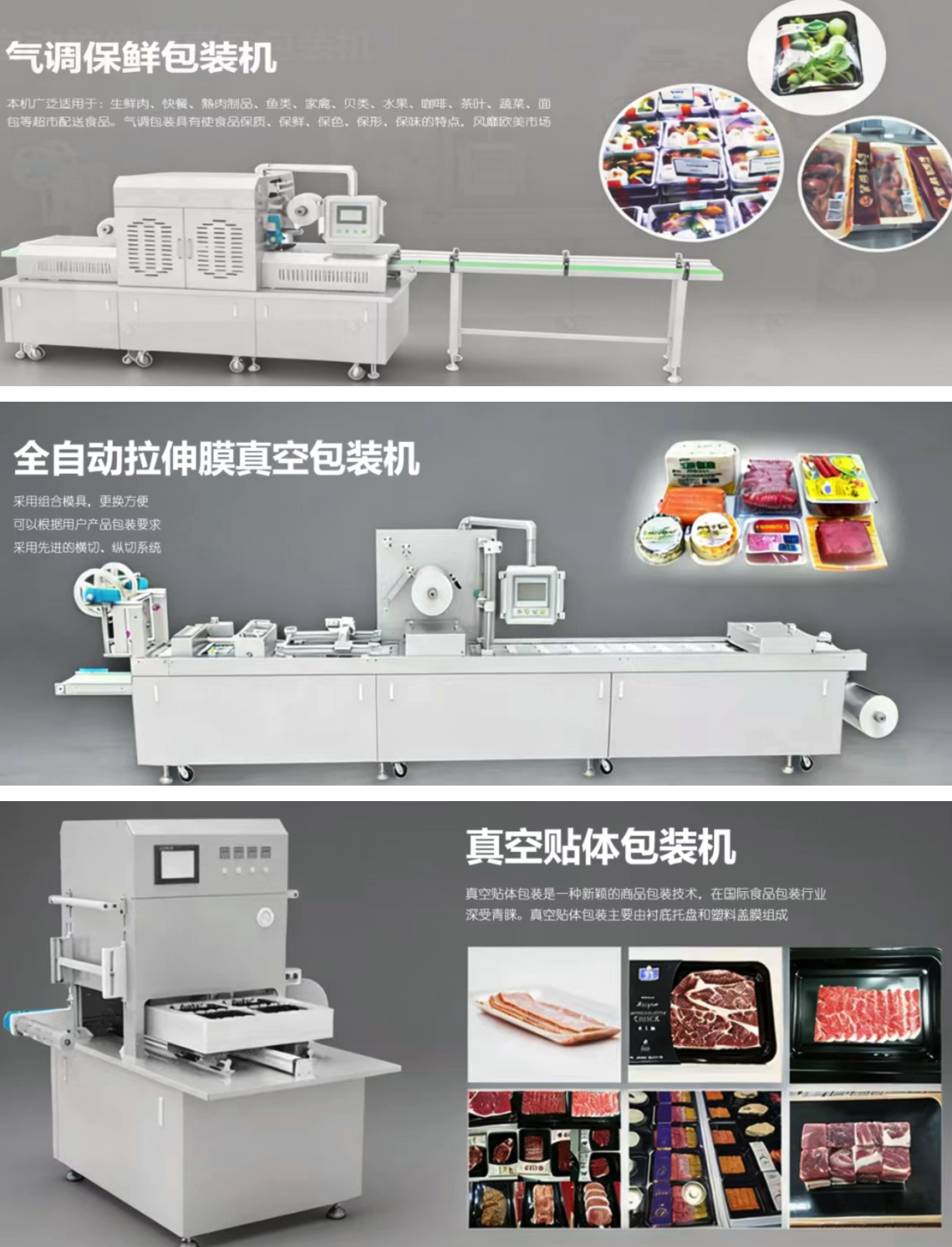 VSP系列真空貼體包裝機具有高貼緊力和自動裁膜系統,使包裝更加完美,多用于牛肉、牛排、海產品、熟食品、火腿、醫療等產品的高端包裝。