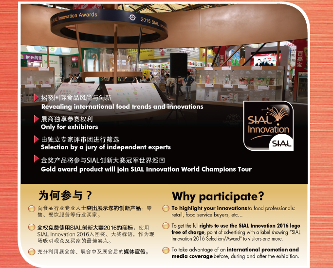 2016年1月開始,您可免費注冊您的創新大賽的參賽產品。請使用您的用戶名和密碼登陸展商中心,點擊SIAL創新大賽專區。